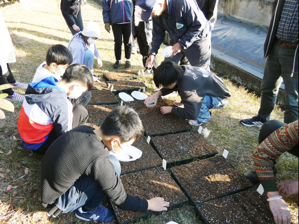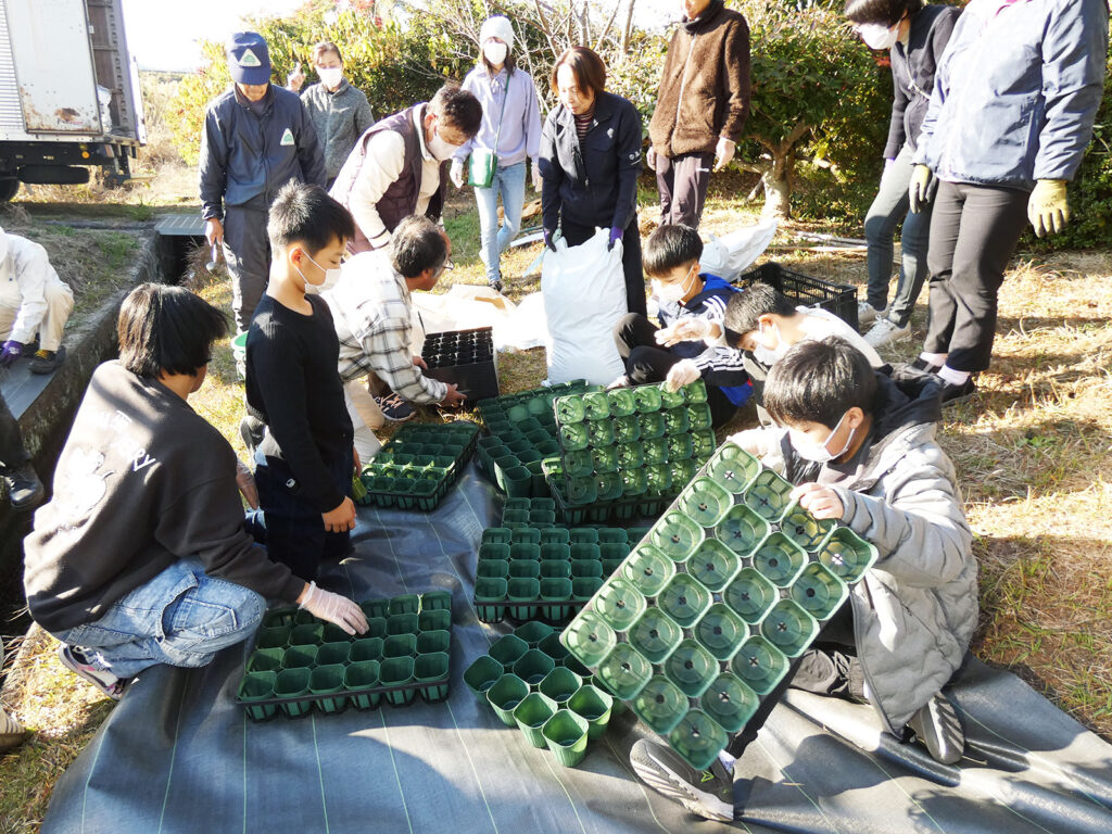 12月6日に勤労体験塾「高泊スコーレ」2回目の活動を行いました。インフルエンザが猛威をふるい、小学生の参加者は少なめでしたが、あたたかな日差しの中、畑・花壇の整備や冬野菜の種まきなどを行いました。種を植えたセルは苗がある程度成長するまで花の海で管理してもらうことになりました。今日植えた野菜の苗は花壇に植えて収穫したり、塾生(参加者)が家で育てたりします。