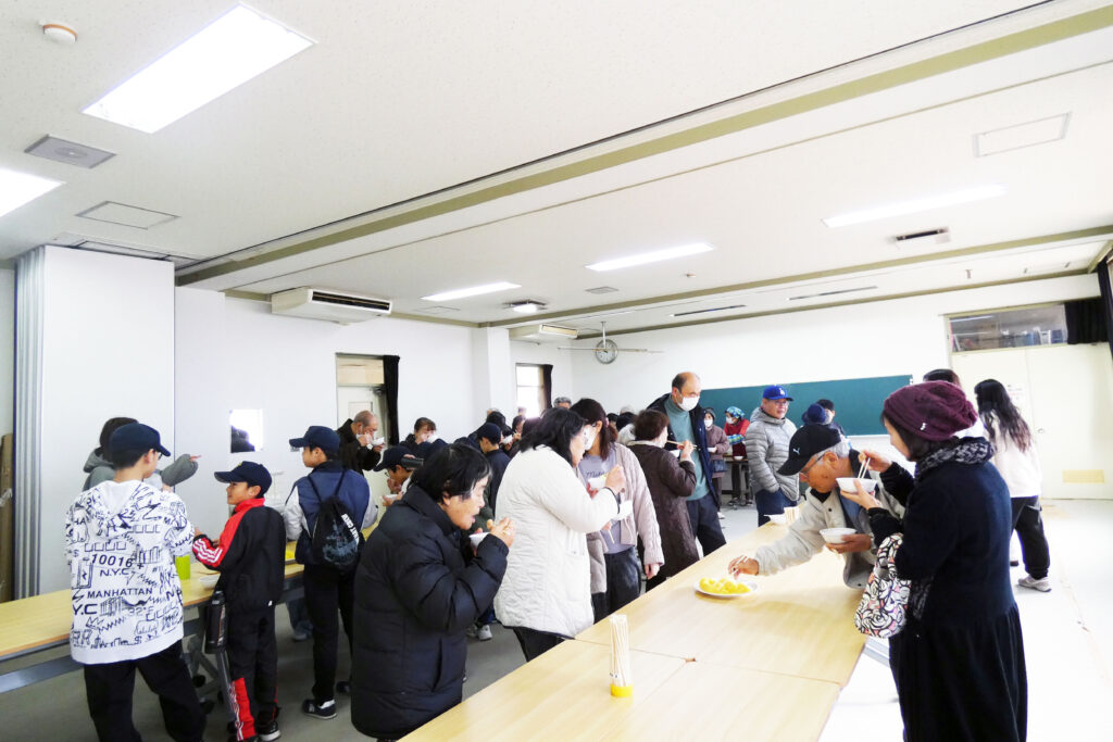 当日来られた方々には事情を話し、輪飾りは受け取って後日火入れを行うこととし、ぜんざいのふるまいのみ行いました。神事と火入れは警報が解除された12日に行いました。