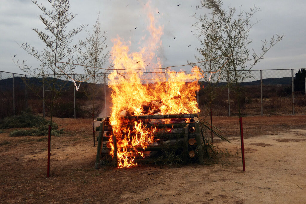 当日来られた方々には事情を話し、輪飾りは受け取って後日火入れを行うこととし、ぜんざいのふるまいのみ行いました。神事と火入れは警報が解除された12日に行いました。