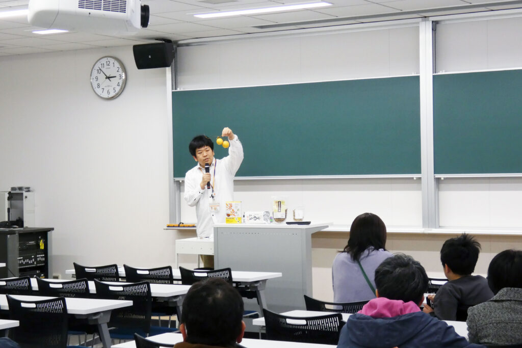 講師は今堀 大輔先生で、講義ではハーブなどの薬用植物が私たちの生活にどのように役立っているかなど教えていただきました。薬草園では、エビスグサ(決明子)の種子取りなどの体験、その後大学生のボランティアスタッフにサポートでハーブのサシェづくりやバタフライピーの試飲なども行いました。