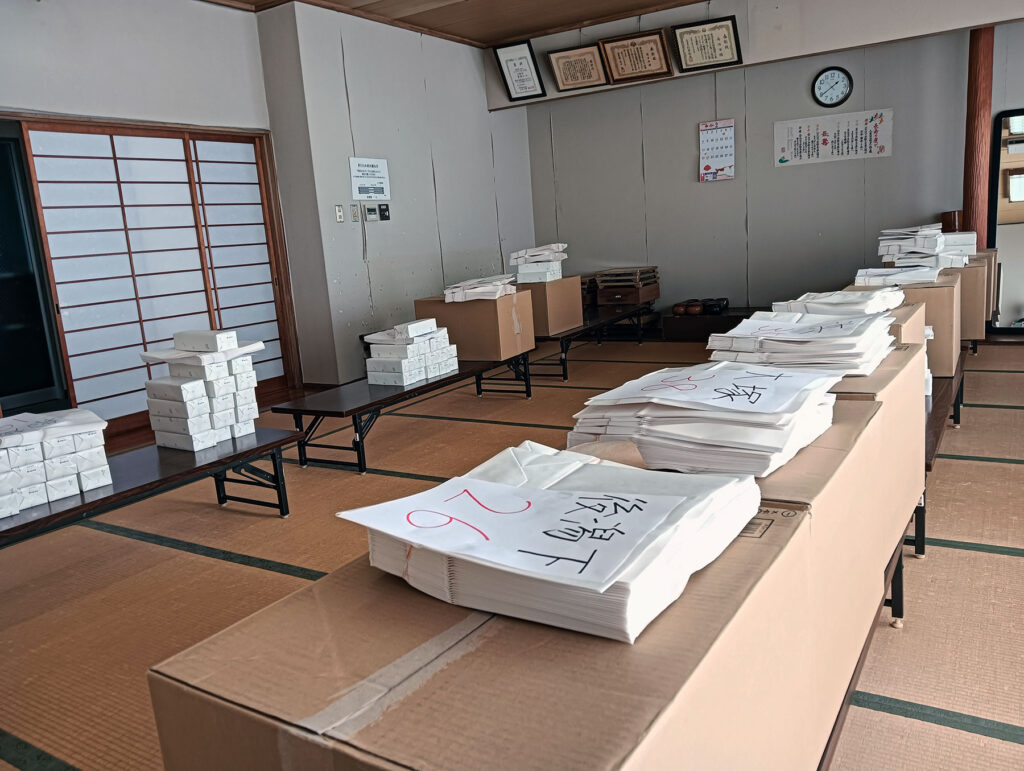 会議後に宅配サービスの物品を自治会ごとに持ち帰り、翌日の宅配サービスの準備を行いました。今年は408名の希望者がありました。