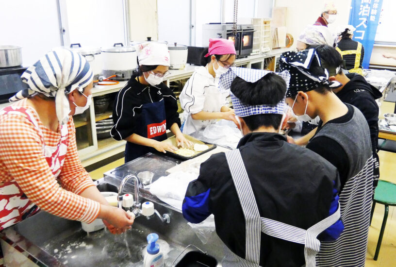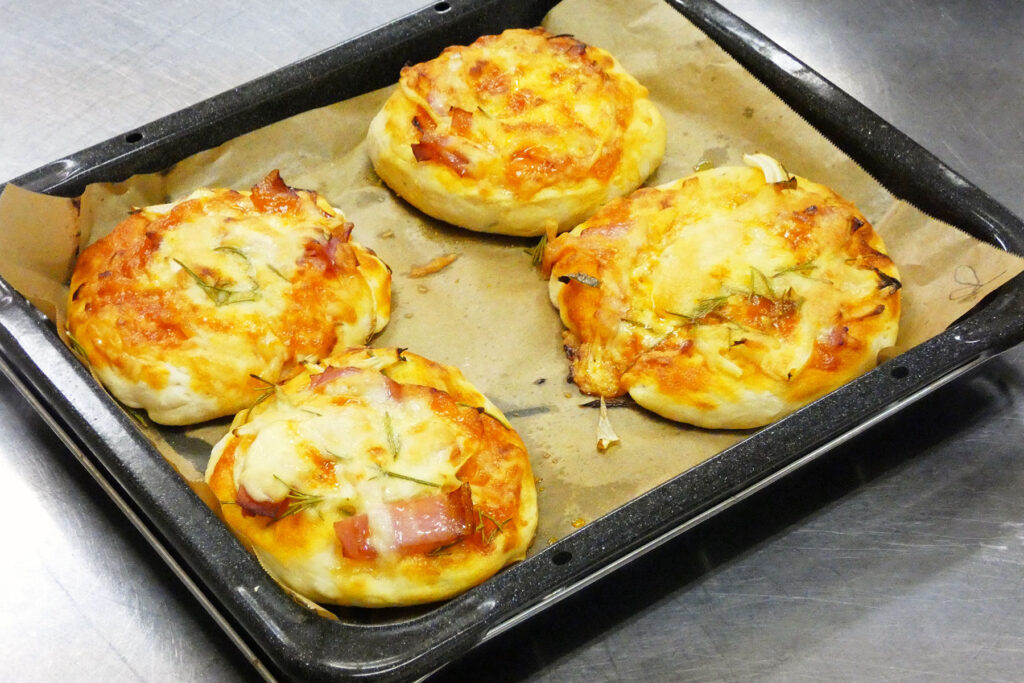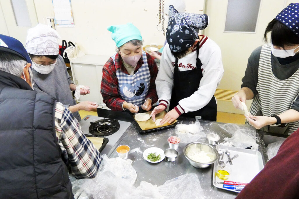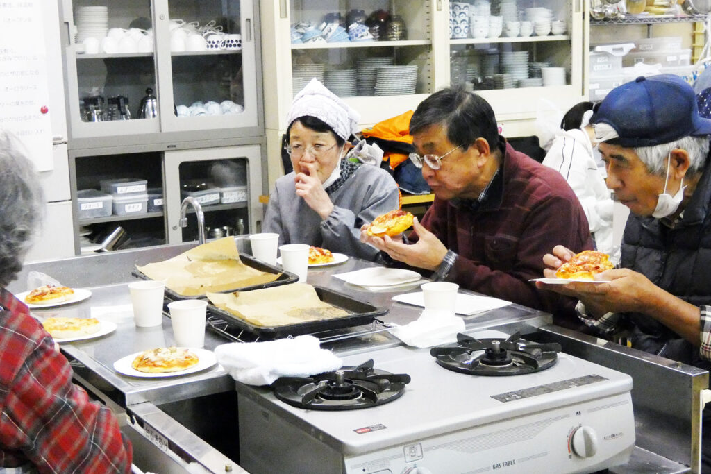 2月7日に勤労体験塾「高泊スコーレ」4回目の活動を行いました。今回は調理実習「ハーブを使った手ごねピザ」作り。人材育成部会員が事前に作って臨みましたが、「とにかくみんな作ろう!」とレシピを見ながら作りました。今回使ったハーブはローズマリー。ビニール袋に粉類とローズマリーのみじん切りを入れ、各自で袋の上からコネコネ。発酵させたあとに玉ねぎ・ベーコン・チーズをのせて最後にローズマリーの葉をパラパラ。オーブンで焼くとローズマリーの香りがほんのりするとってもおいしいピザになりました。飲み物と一緒に試食し、ハーブ料理を味わいました。終わった後は第2回でまいたサニーレタスと子カブの配布を行いました。