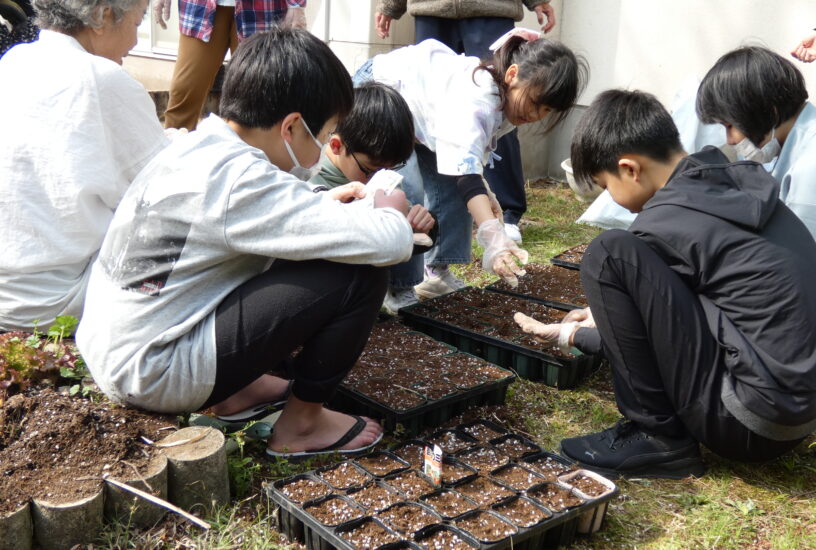 3月28日に勤労体験塾「高泊スコーレ」5回目の活動を行いました。今回は冬に整備した畑に春夏に向けたハーブの苗を植えたり、夏野菜の種をポットに蒔いたり、冬に植えたレタスと子カブの収穫を行ったりしました。植えたハーブは「コモンセージ」「オレガノ」「レモングラス」「ヒソップ」「レモンタイム」「ローズマリー」「コモンタイム」「レモンバーム」「ラベンダー」です。これから暖かくなるので成長が楽しみです。